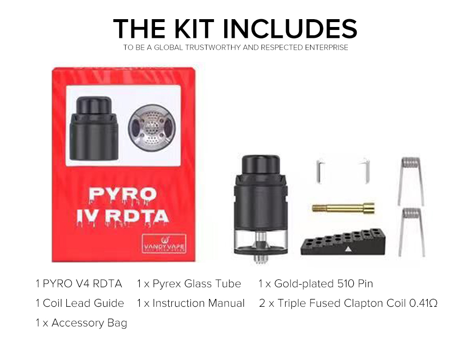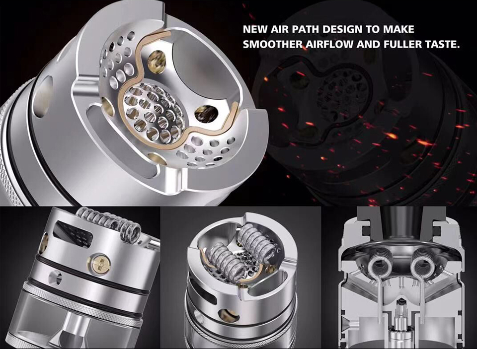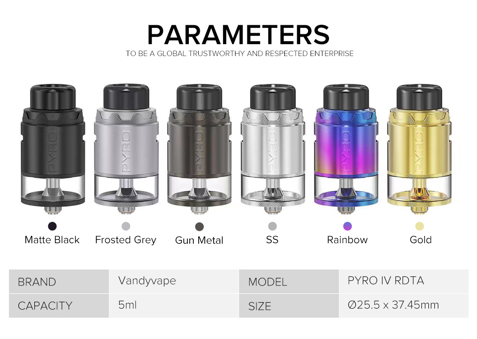 Vandy Vape PYRO IV RDTA features its innovative side-filling hole so that you can refill the e-liquid from the side. Its increased 5ml e-juice capacity ensures you to use for longer use time. The deck supports single/dual Coil building and the honeycomb design can provide you smoother airflow and fuller taster. Moreover, the device adopts top airflow for preventing leakage of e-liquid.