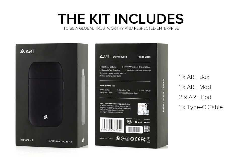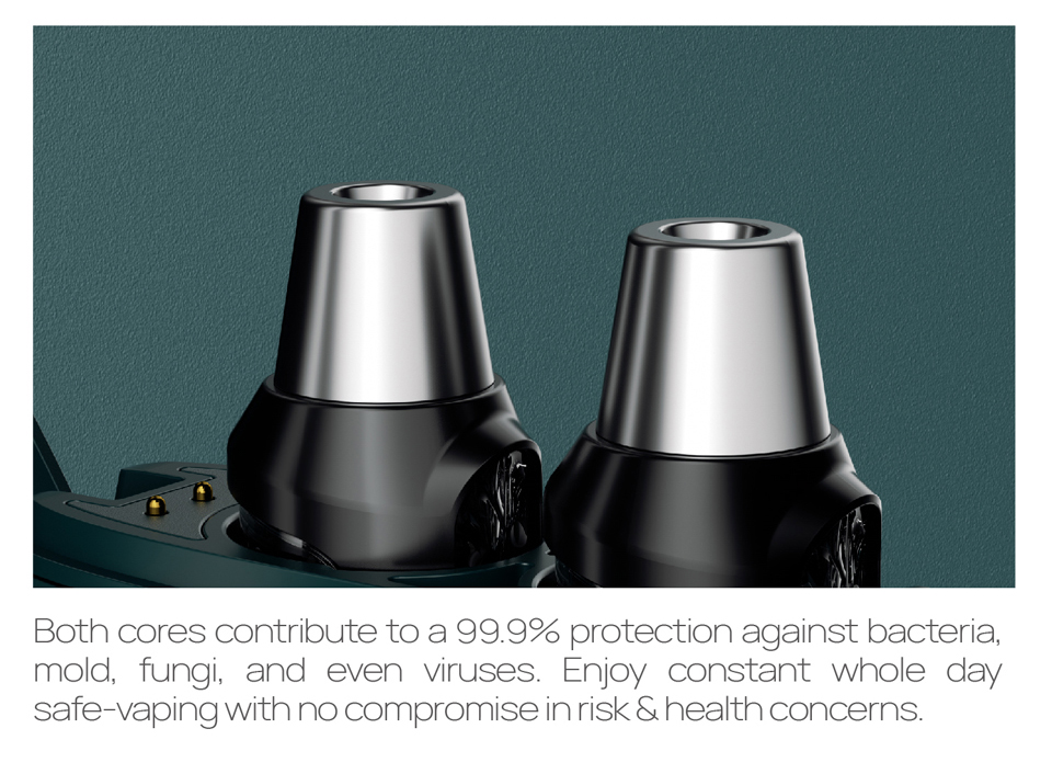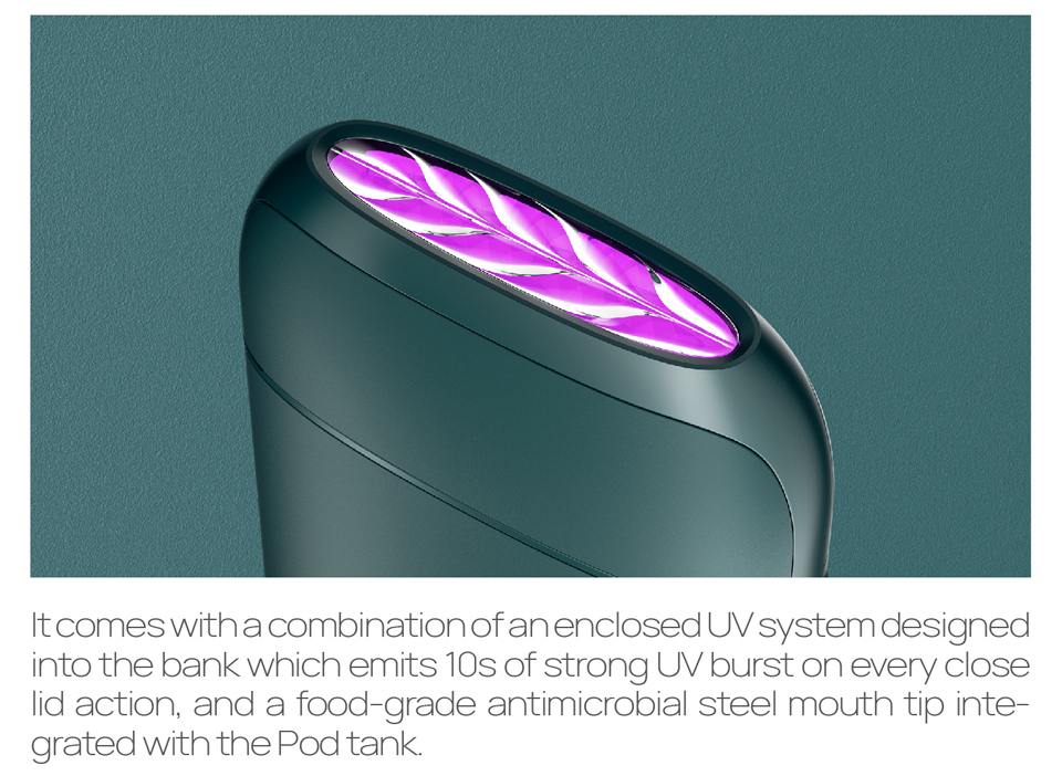 VapX ART PCC Kit is a simple, compact and portable device with no hassle. It consists of a Charging Box, a Mod, and 2 Pods. The Pod has a 1.4ml capacity and adopts food-grade antimicrobial steel Drip Tip which contributes to a 99.9% protection against bacteria, mold, fungi, and even viruses so that you can enjoy constant whole day safe-vaping with no compromise in risk &health concerns. The Mod has a 300mAh built-in battery and the Box has a 800mAh one. You can put the Kit back into the Box for instant pod recharge after using, and the box only needs 10 minutes for full charging. Last but not least, the capsule comes with a combination of unenclosed UV system designed into the bank which emits 10s of strong UV burst on every close lid action.